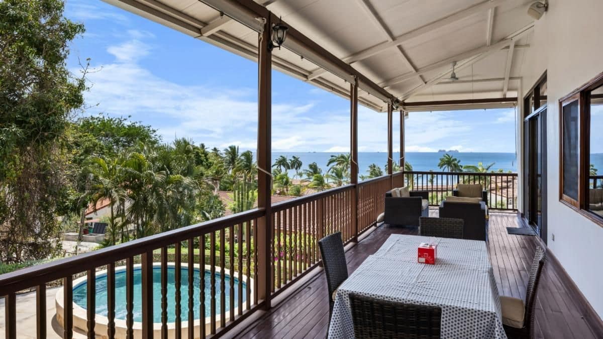 Set on a 2,224 m² titled lot with an additional 2,595 m² untitled parcel behind, the estate features beautifully landscaped grounds, a round dipping pool, spacious terraces, and breathtaking views of lush greenery and the Pacific Ocean.